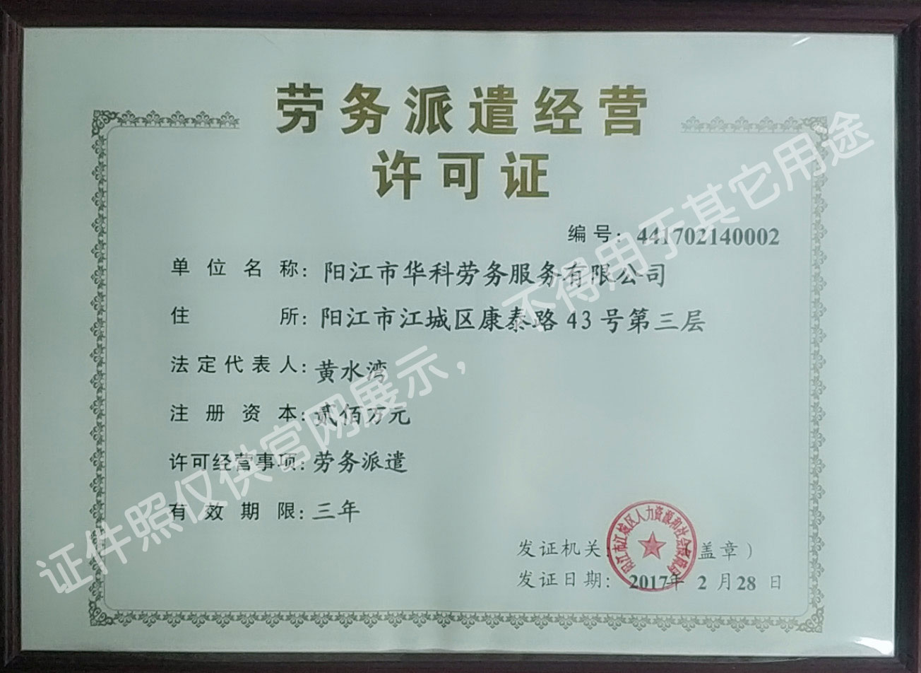 華科勞務服務有限公司是專業從事人事代理、勞務租賃、人力派遣及管理的綜合性服務機構,是首批獲得廣東省人力資源廳、陽江市勞動和社會保障局頒發人力資源許可證的合法單位。公司秉承“誠信務實、專業熱情、滿意第一、服務社群”的經營理念,在勞務派遣業務的基礎上,更致力于合同制工人(臨時工、實習生、假期工)方向發展,為用工企業及時輸送合格的各類人才,合理調配人力資源的有序流動,幫助求職者尋求更加滿意的就業渠道和崗位,切實維護求職者的合法權益。